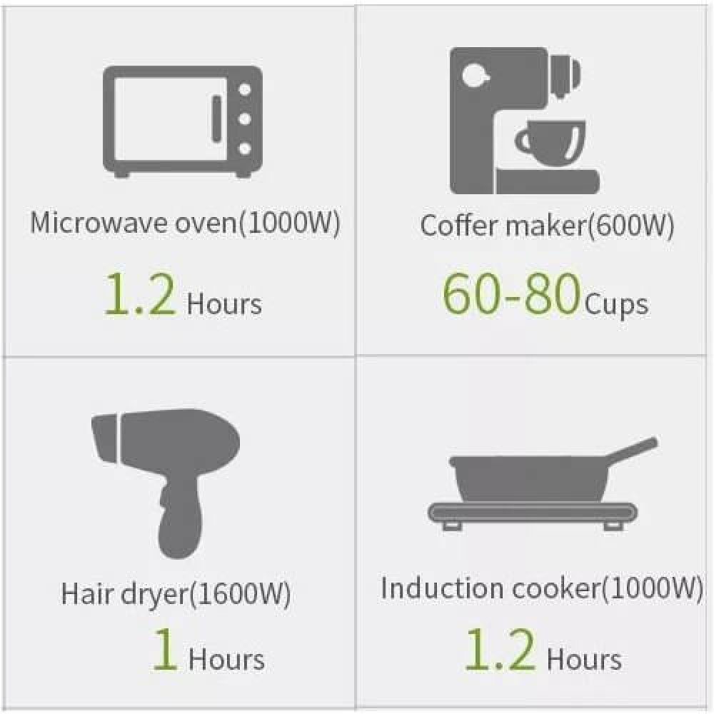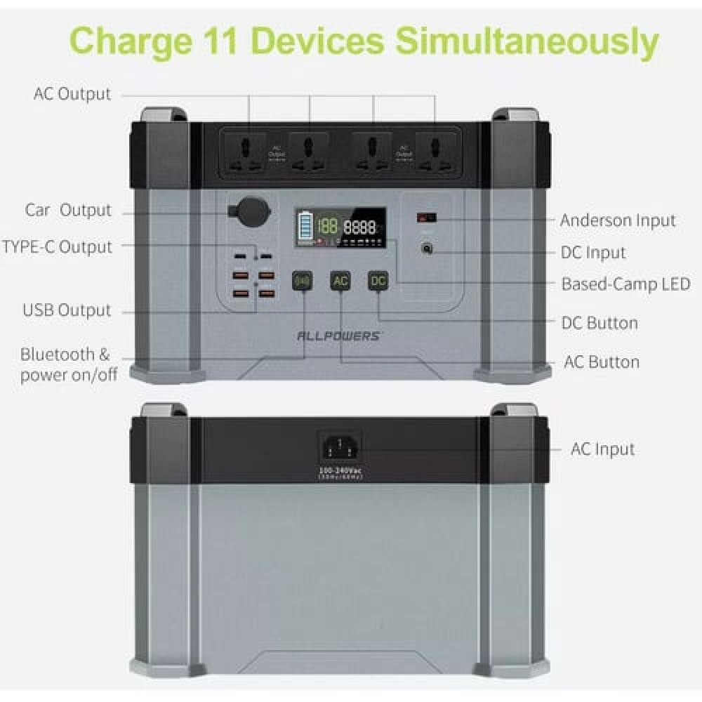 Завдяки акумуляторній батареї потужністю у 2000W і місткістю у 1500Wh ALLPOWERS AP-SS-009 готовий живити безліч різноманітних приладів, що використовуються як вдома, так і за його межами. Це більшість побутової техніки, наприклад, телевізор, холодильник, кавоварка, кондиціонер, тостер, мікрохвильова піч, блендер, соковидавлювач, фен тощо, будь-які гаджети – телефони, ноутбук, планшет, Wi-Fi роутер, дрон, електроінструмент, делікатне медичне обладнання і, навіть, електромобіль.