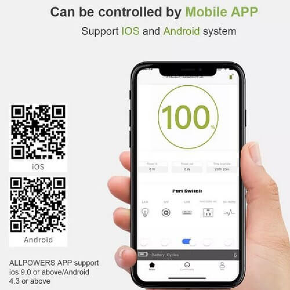Вся інформація по роботі портативної електростанції відображається на РК-дисплеї, що знаходиться на лицевій її стороні. Разом з тим вона підтримує бездротове підключення через Bluetooth за допомогою додатка ALLPOWERS. Технологія bluetooth забезпечує стабільний зв’язок для дистанційного керування станцією практично будь-де. Тож можливо точно визначити рівень заряду батареї, проконтролювати роботу того чи іншого входу/виходу електростанції на своєму смартфоні навіть на відстані понад 10 метрів.